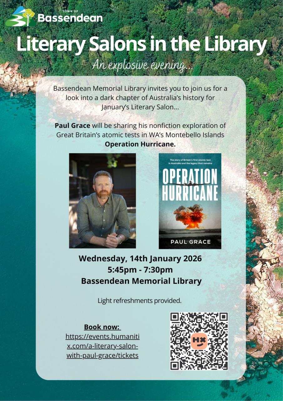 Join us for an evening with Perth author Paul Grace, presenting his acclaimed debut book Operation Hurricane: The Story of Britain’s First Atomic Test and the Legacy That Remains. Drawing on extensive research and a deeply personal family connection- his grandfather served in the RAAF during the Montebello Islands tests- Grace offers a compelling Australian perspective on an event long overshadowed by British accounts.