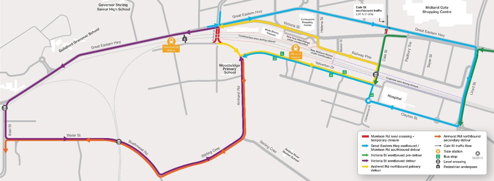 During the shutdown the Morrison Road level crossing in Midland will also be closed to vehicles and pedestrians from 12.30am on Thursday, 22 January and 12.00pm on Sunday, 22 February (times subject to change). Please see map below for information on road detours and alternative routes.