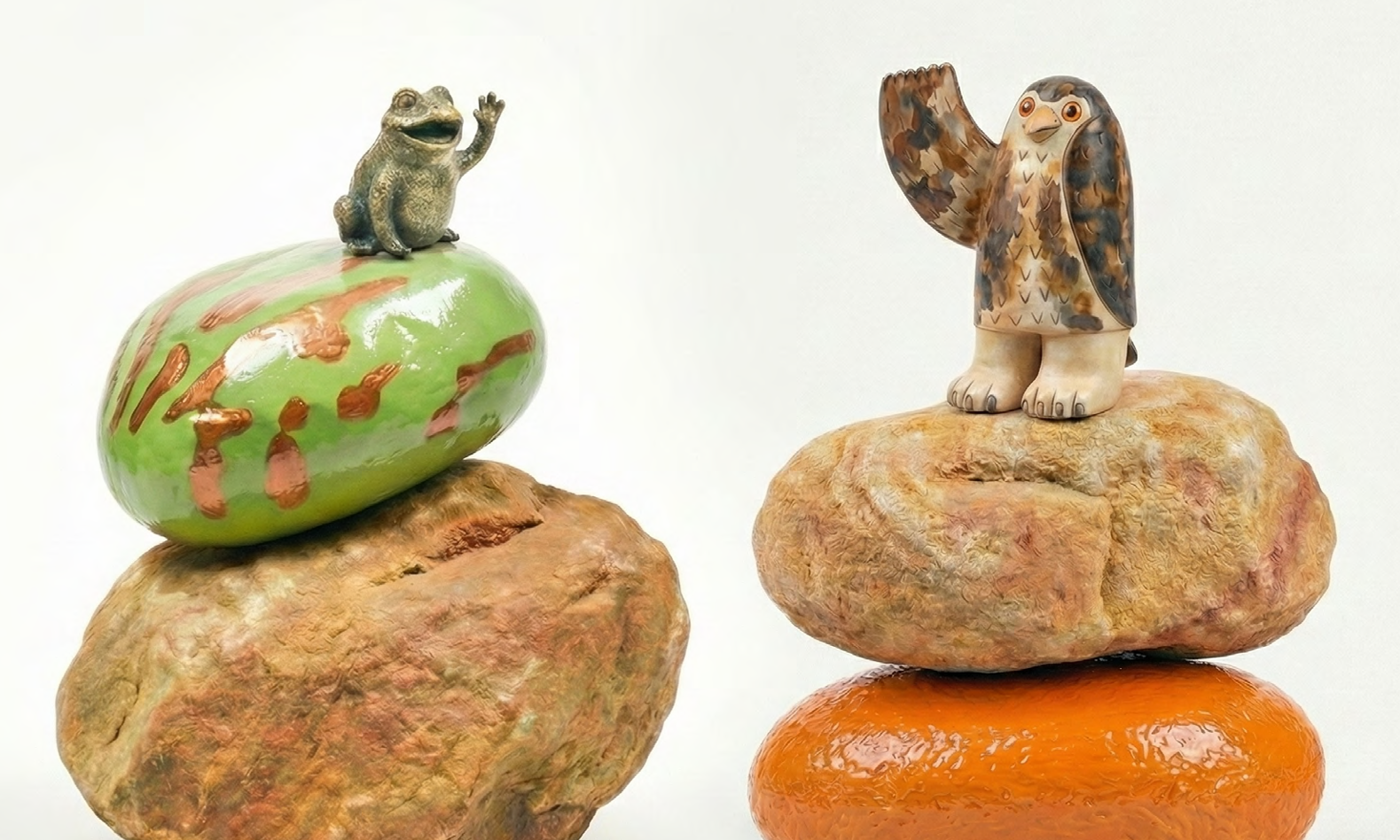 Standing approximately 1.2 metres tall, the work combines rugged natural boulders with vibrant colours, painted finishes and multi‑textured forms.